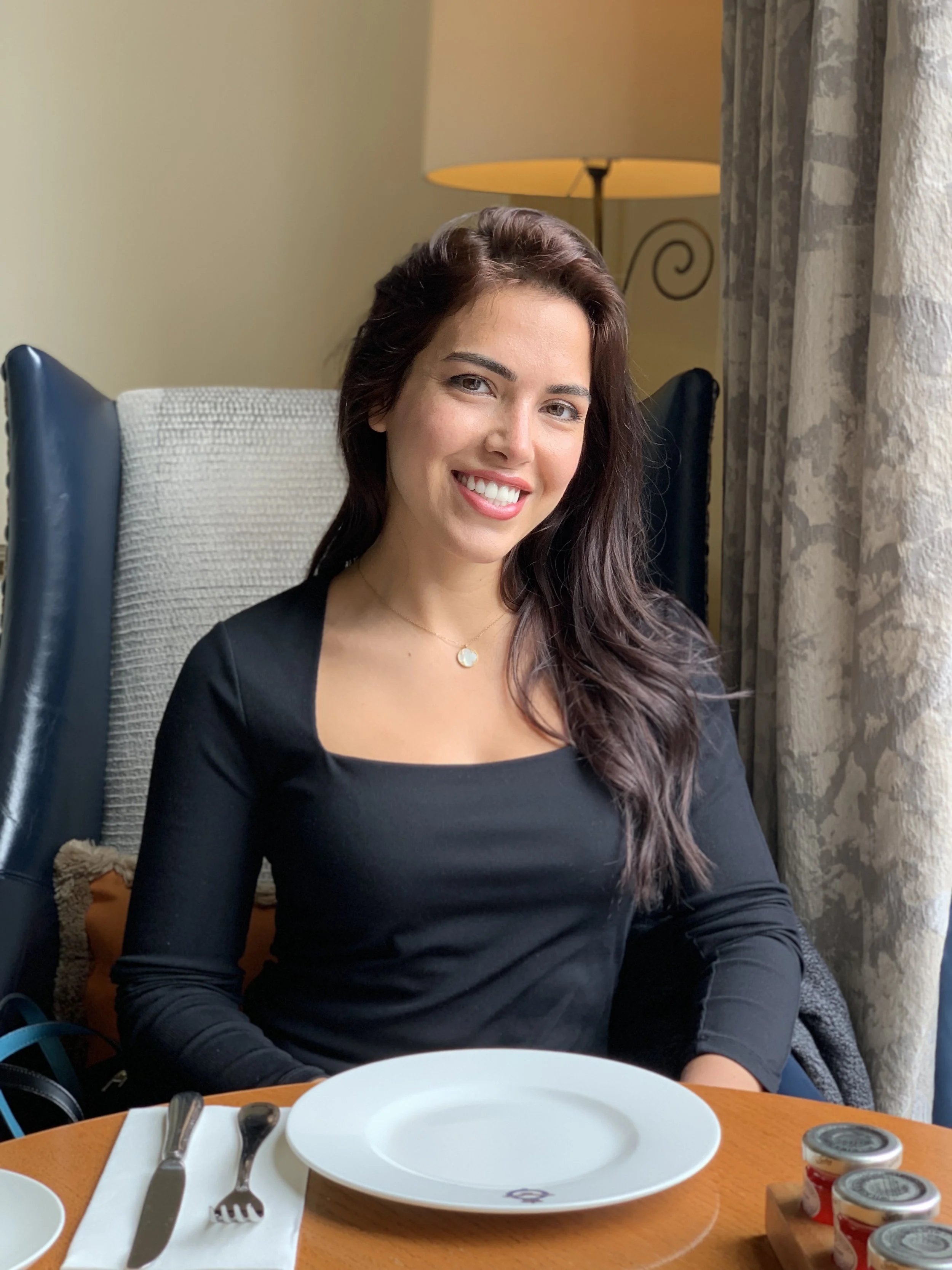 A woman in a black shirt sitting at a table with a white plate and cutlery, smiling at the camera.
