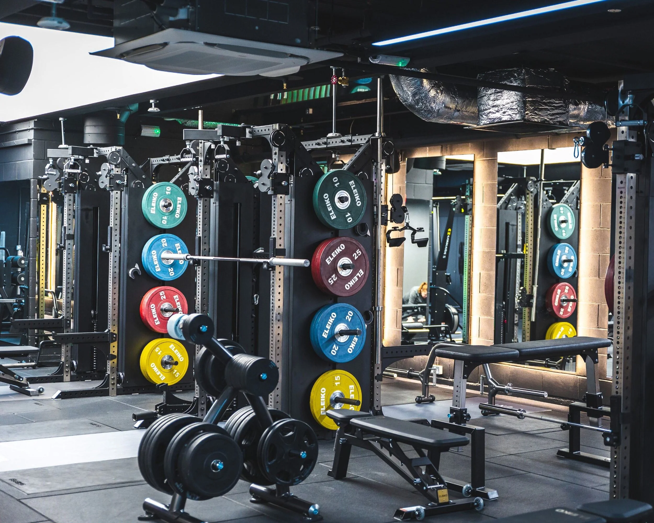 A modern gym interior featuring weightlifting equipment, including a barbell rack with colored weight plates, several benches, and dumbbells on a rack. The gym has mirrors and ceiling-mounted ventilation.