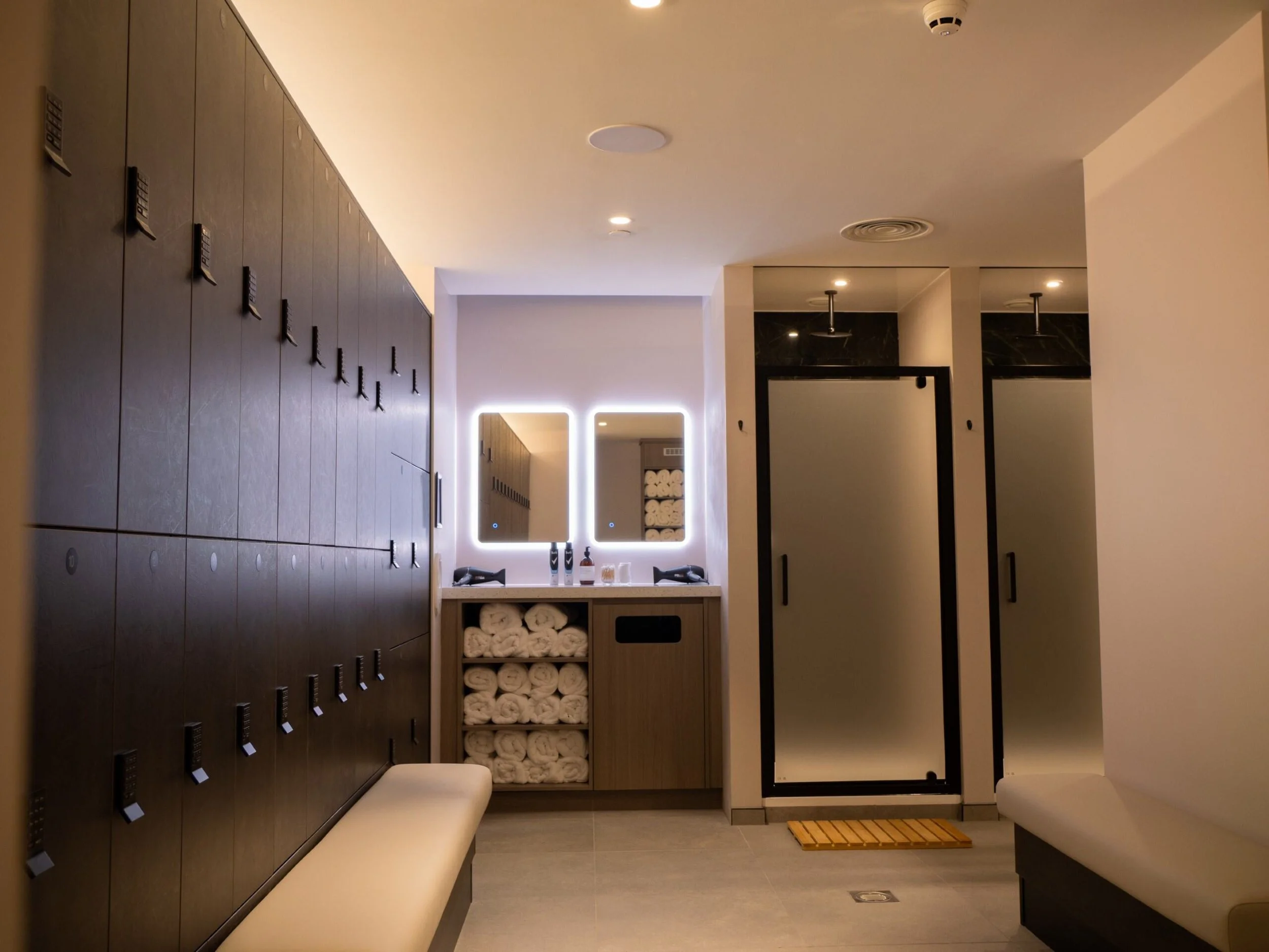 Modern locker room interior with lockers, benches, rolled towels, mirrors, and shower stalls.